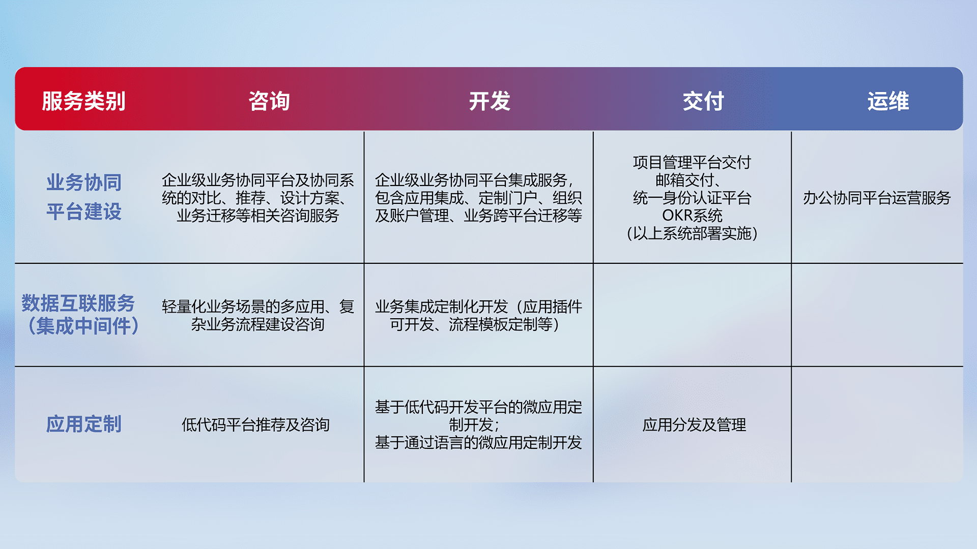 针对钉钉、、、、企微、、、、IDaas等平台级产品提供产品的规划、、、、方案、、交付、、、、定制化开发等服务,,,,实现如统一协同办公、、智能客户服务、、、、混合会议管理、、、、智能数据查询、、、、等业务场景,,,,实现数字化转型。。。